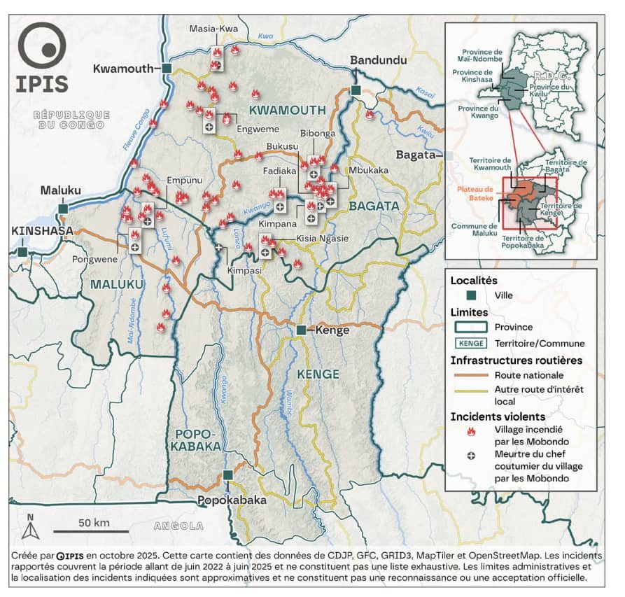 Carte des villages attaqués et incendiés par les Mobondo et où certains chefs coutumiers Teke ont été assassinés (juin 2022 et juin 2025)